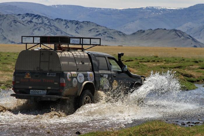 За поселком преодолели полуметровый по глубине брод через речку Буянт-Гол метров двадцати шириной. При этом настолько отвлеклись на фотографирование радужных брызг, летящих из-под колес внедорожников, что в итоге ушли в сторону от нужной нам колеи вверх по реке, разобравшись в ошибке только километров через десять.