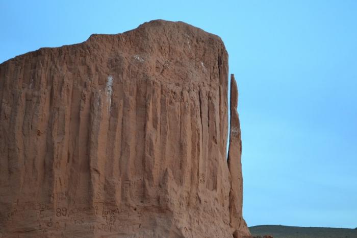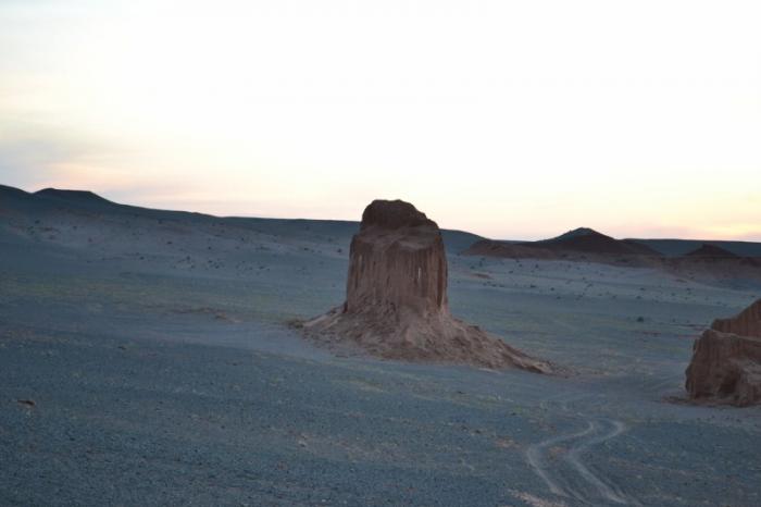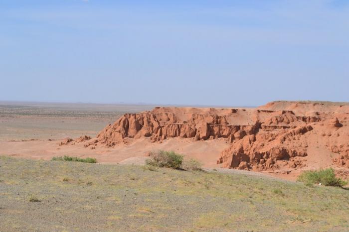 Теперь, следуя выбранному маршруту, мы направляемся на север, к урочищу Баянзаг. В этом обрыве, сложенном из уже знакомых нам красноцветных глин и песчаников, образовавшемся путем вымывания и выдувания почвы, в двадцатые годы двадцатого столетия американские археологи обнаружили первое монгольское местонахождение останков динозавров и кладок динозавровых яиц.
