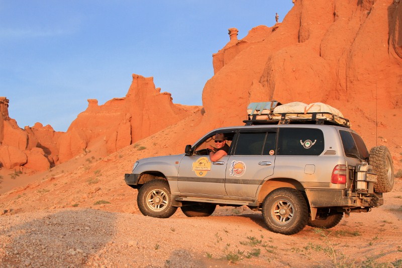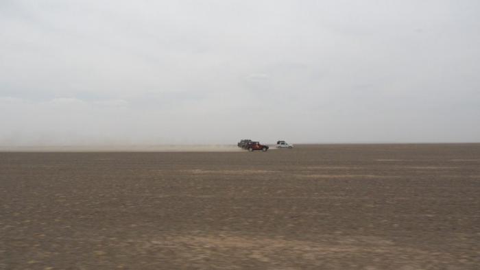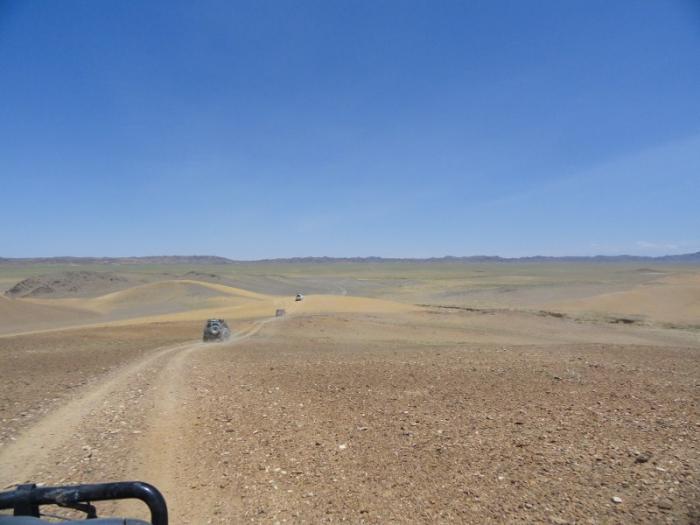 Перевалив через хребет Гурван-Сайхан по ничем не примечательному извилистому перевалу Баян-Сумбер (2083 м), скатились на равнину, не имеющую название на картах, но имеющую такую ровную поверхность, что можно было без опаски гнать под сотню километров в час, выстроившись широкой шеренгой. Нет ни рытвин, ни сайров, ни крупных камней и других противных неприятностей не позволяющих ездить по Монголии так быстро. Почти сто лет назад члены американской археологической экспедиции назвали это плато «стомильным теннисным кортом».