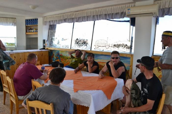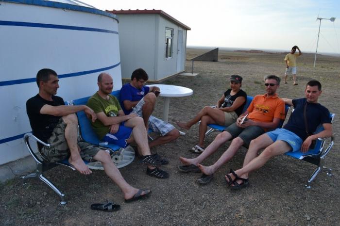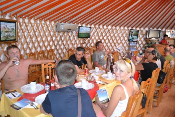 Отсюда открывается панорамный вид на окружающую равнину. На территории кемпинга имеется хороший душ, ресторан, построенный в виде большой юрты, телевидение с российскими каналами, даже баскетбольная площадка. Приветливый персонал накрывает обильный стол, за которым мы с удовольствием совмещаем пропущенный обед и наступающий ужин.