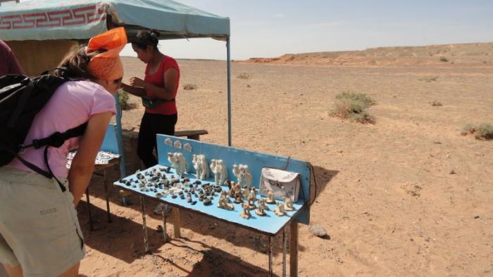 На краю плато, перед обрывами торговцы раскинули несколько сувенирных палаток, в которых предлагают немудреные сувениры с местной тематикой – куски окаменелых деревьев, поделочные камни, изделия из войлока и шерсти.