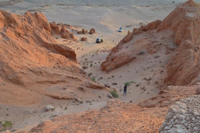 Ровное плато, по которому мы так шикарно гнали, закончилось обрывами и уступами красного цвета, изрезанными оврагами разных форм и очертаний. Оказалось, что это и есть известный каньон Баянзаг.