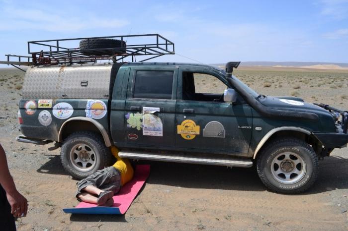 Отломиться на маршруте может многое, можно и картер движка, моста либо коробки пробить, и полуось бывает лопнет, и шпильки со ступицы вырвет. Вобщем в Монголии сварщик – главный ремонтник. По монгольски ремонт – засвар! И этот «засвар» желательно иметь с собою в виде сварочного аппарата, болгарки и дрели, работающих от инверторов.