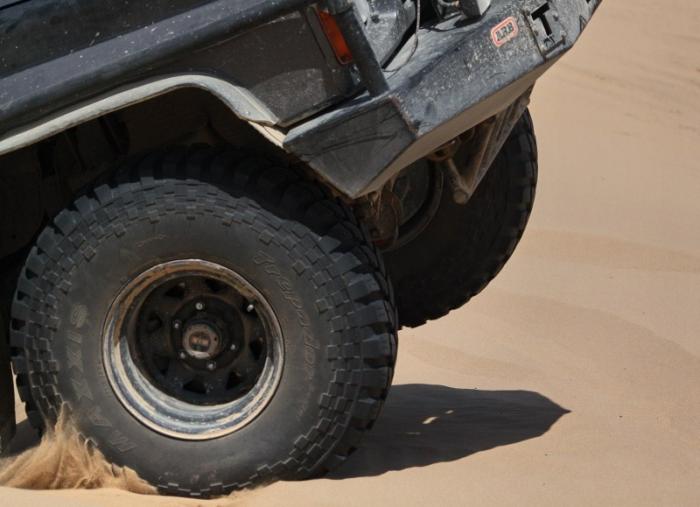 Серьезной внедорожной резины в таких поездках не требуется, как по рисунку, так и по размерности. 33-х дюймов АТ или МТ хватит с лихвой. Главное, чтобы резина была изначально целой, без серьезных залеченных проколов и порезов, желательно вообще новая. Крайне желательно иметь две запаски. Повредить даже новую резину в камнях или ветками саксаула очень просто. Требуется аккуратность в вождении. Ну и обязательно иметь с собой ремкомплекты для ремонта резины (жгути, грибки, заплатки), запасные камеры, монтажки и умение всем этим добром пользоваться.