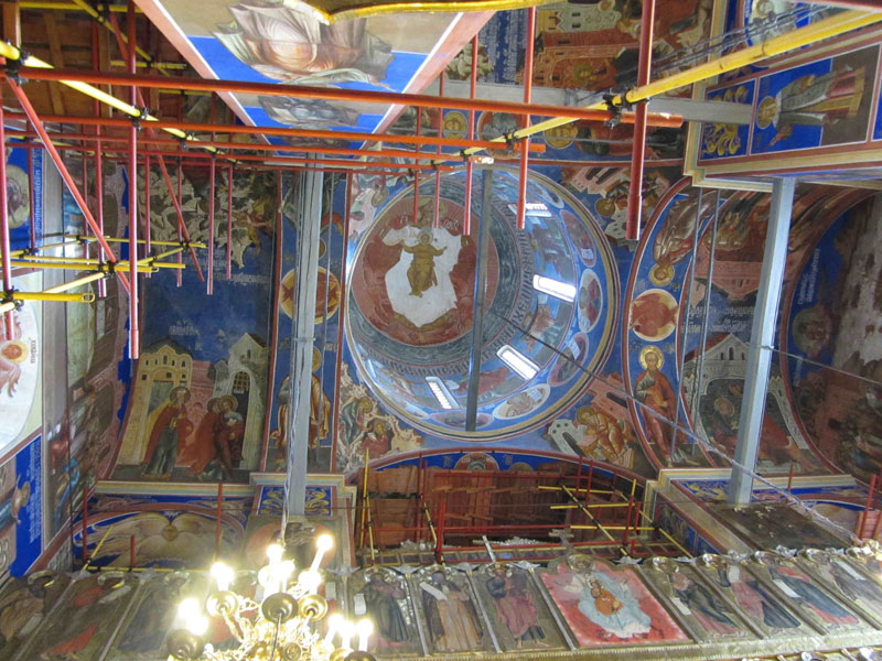В кремле очень красив Рождественский собор. Синие с золотыми звездами купола, внутри богатая роспись. Он не приземлен, а кажется стремится вверх (если смотреть внутри). А потому возникает аналогия с готическими соборами. Фрески впечатляют: