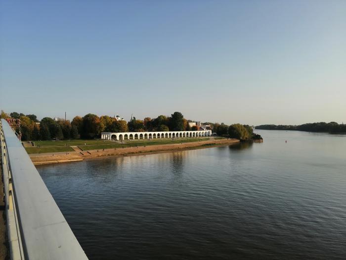 В общем погуляли по территории и пошли через мост на другой берег реки Волхов.