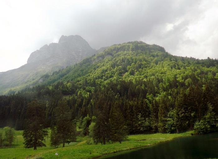 Утром мы увидели в своём окне такой уютный мирный деревенский пейзаж: зелёные волны гор, свежая майская зелень альпийских лугов и приютившиеся на склонах гор несколько домиков с красными крышами.