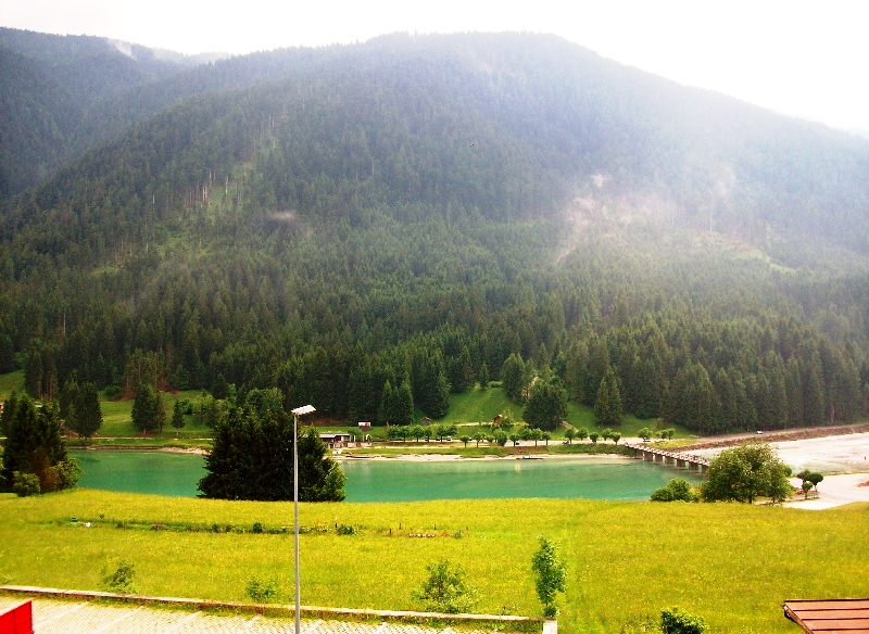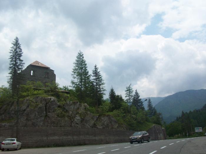 А мы продолжаем наш путь, дорога идет все выше и выше.К сожалению погода в горах меняется быстро и вот уже мелкий дождик моросит, тучки ходят.Пусть к перевалу Sella di Razzo лежал сквозь туман и моросящий дождь – погода испортилась и Италия встречала неласково. Горы были уже другие – серые громадины без единого деревца и кустика на морщинистых скалах. Их вершины скрывали серые тучи, но они всё равно завораживали своим величием и строгой красотой. Кое-где на склонах, прямо у дороги, лежал снег. Это уже были Доломитовые Альпы.
