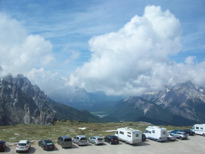 Мы поднимались к Tre Cime di Lavaredo. Вертикальные башни массива пока угадывалась где-то вверху, манили нас своими грозными силуэтами.По дороге наблюдали интересную картинку.Навстречу нам спускалась итальянская семья.Женщина катила коляску с малышом, а ее спутник-папа нес перед собой в кенгурятнике другого маленького члена семьи. Картина типичная для Италии, где рождаемость особенно на юге повышенная.Но что-то здесь не так.Эта картина была бы типична для прогулки по городку, по парку, а здесь высокогорье.Получается, что они без автомобиля просто гуляют здесь, вот так с младенчества итальянцев приучают к горам и здоровому образу жизни.Так мы медленно поднимались вверх, навстречу нам двигались велосипедисты, по обочине шли люди приемущественно с палками для горной ходьбы.Дорога довольно крутая – на последнем участке длиной 3 км набор высоты почти 500 м.