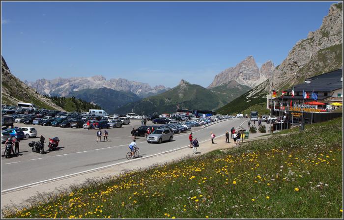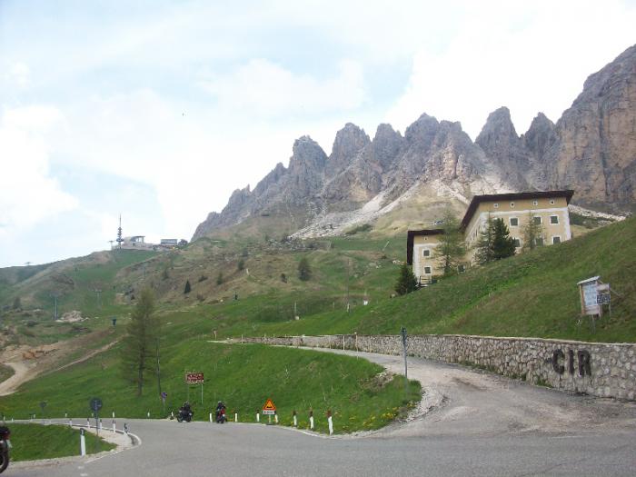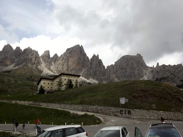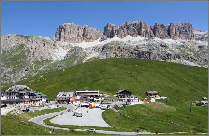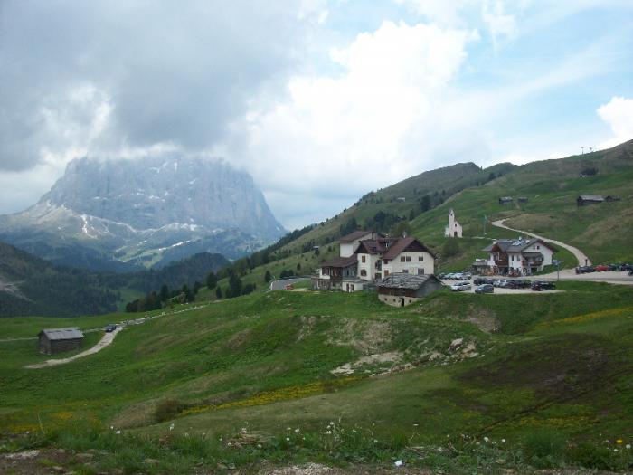 Чуть дальше нам встретился кортеж ретро-автомобилей: с бравым видом по асфальту катили разноцветные «Фиаты». Чего только в дороге не увидишь! Снова очередная развилка: вправо вниз спускается дорога в долину Гардена(val Gardena)c поселками Selva Gardena и Santa Cristina далее по этой дороге можно проехать к Ortiseiс выездом на автомагистраль к Тренто и Больцано.Но нам надо дальше снова на очередной перевал.Снова от нас справа высится Sassolungo к нему примыкает Sassopiatto.На подъеме к перевалу находится горный отель