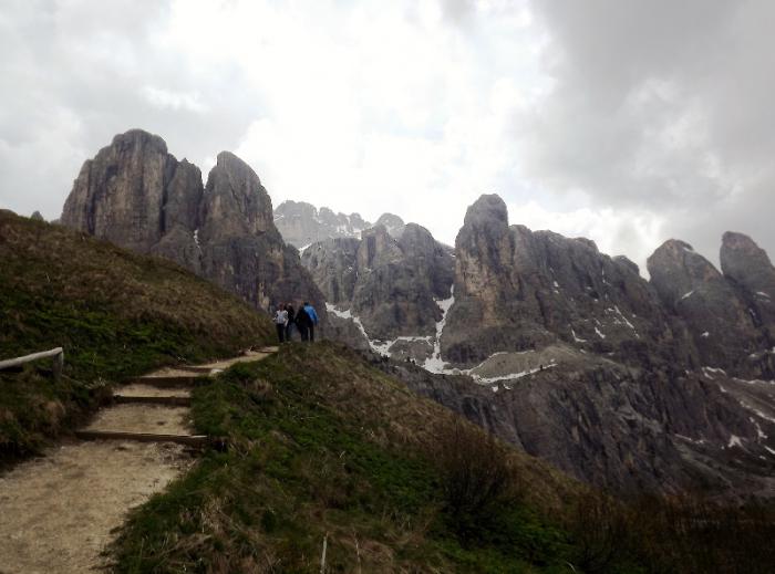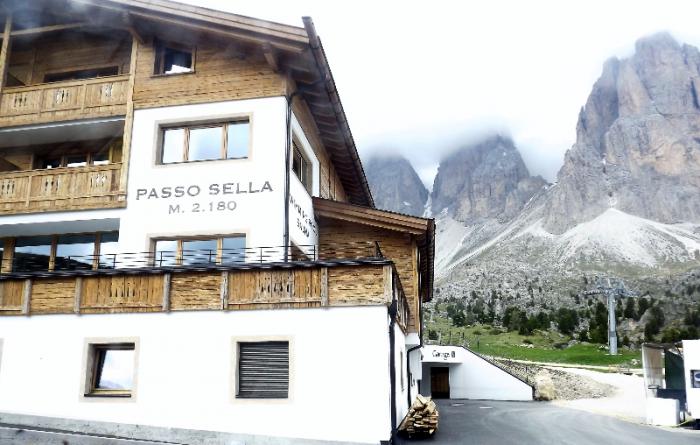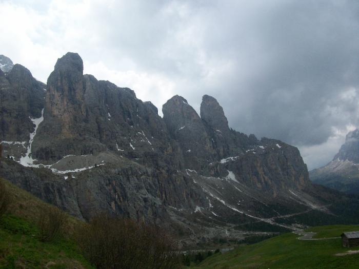 Перевал Passo Sella (2244м) предстал в приглушённых, мрачных тонах – погода поменялась и стало пасмурно, как осенью. Но величие высившихся перед нами гор с заснеженными вершинами впечатляло всё равно.