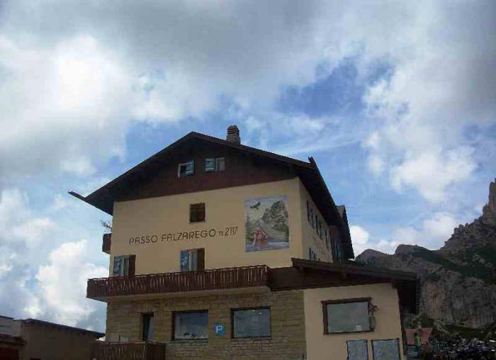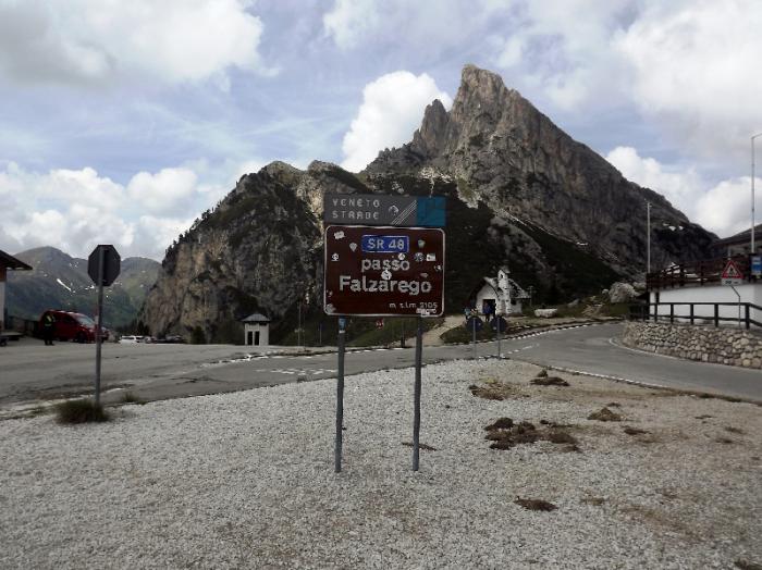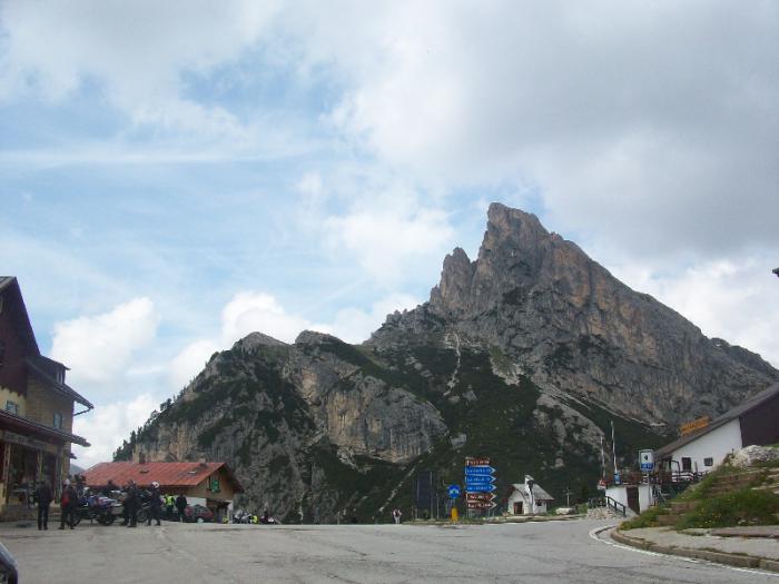 Снова вверх.Кортина позади.В местечке Pocol развилка.Нам надо прямо к Passo Falcarego.А влево на Passo Giau, но там мы уже побывали в первую нашу поездку в сентябре 2012 года. Passo Falzarego (2117м) – перевал суровый. Когда глядишь снизу вверх на уходящие ввысь отвесные скалы и где-то там, высоко-высоко различаешь их границу с небом, не сразу можно разглядеть маленькую тёмную точку – станцию канатной дороги. Находится она на вершине горы Lagazuoi, Вагончик фуникулера медленно плыл в воздухе, и было непонятно – как не страшно подниматься так высоко. И вместе с тем ужасно хотелось испытать эту остроту ощущений – подъём на скалу. Однако было облачно, погода менялась и солнце куда-то неожиданно исчезло. Мы поняли, что увидеть что-либо мы не сможем из-за плотной завесы облаков. А просто проболтаться между небом и землёй, не видя ничего, как-то не очень хотелось. Да и не дешёвое это удовольствие для нас. Зато в магазинчике напротив удалось приобрести интересный фотоальбом «Dolomiti» за 9 Э.