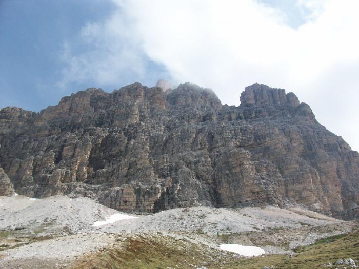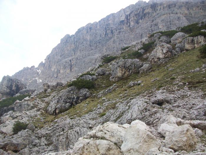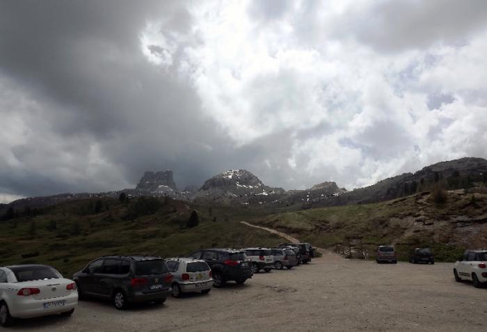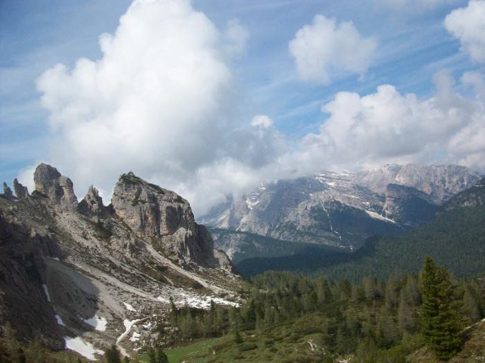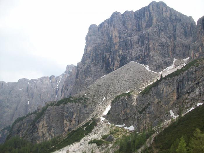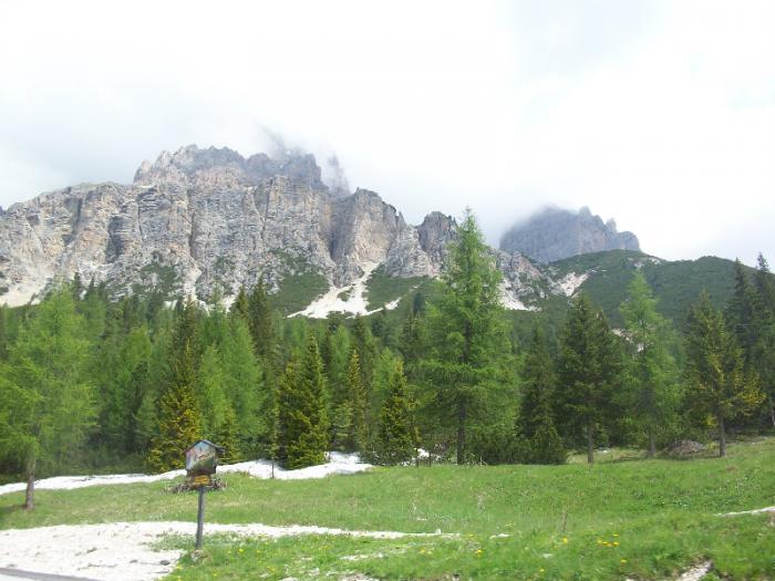 Если подняться к приюту то здесь хорошая панорамная площадка.Видны в дымке облаков близлежащие высокогорные вершины Доломитов: Cima Sorapis(m3205)Croda da Lago(m2715), Monte Cristallo(m3221).Conturines(m3064).