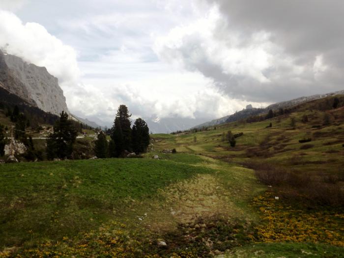 Подъём на перевал Passo Campolongo (1875м) был не очень крутым. С высоты открывались удивительные виды, в палитре которых преобладал ярко-зелёный цвет. По зелёной траве были разбросаны жёлтые крапинки одуванчиков – в горах в это время (в самом начале июня) они только цветут.