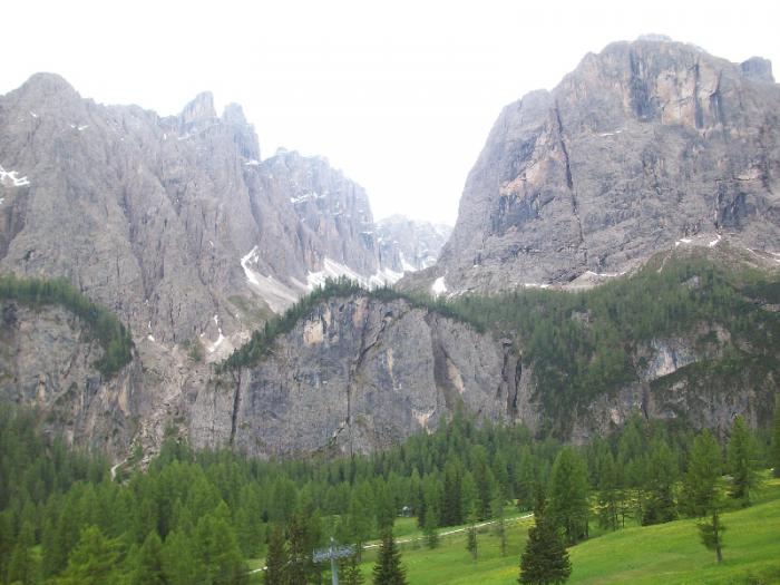 В тумане облаков явился нам и перевал Passo Pordoi (2239м). Кое-где белели островки снега – так непривычно для тех, кто снег видит только в зимние месяцы, но никак не в июне.Вагончик канатной дороги на гору Sass Pordoi в тумане не виден воообще, казалось что канатка не работает, но вот показался.значит работает.видимость ужасная, что мы там можем увидеть?.. Да и с фотографией как-то не вышло сфотографировать нормально перевал: батарейки подсели. Поэтому публикую здесь фотографию не свою при отличной солнечной погоде