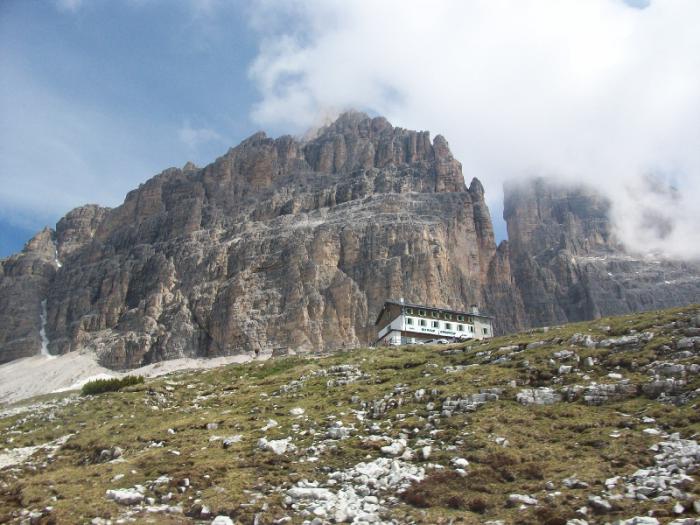 У самой стены Tre Cime di Lavaredo находится высогорный приют Rifugio Auronzo (выс. 2333 м). Хижины (rifugio) – основное жилье на высокогорье в Доломитах. Их достаточно много. Следующий ближайший приют — Rifugio Lavaredo. Он находится не так далеко – минут 15 ходьбы.