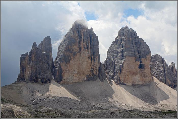 И вот Tre Cime di Lavaredo перед нами. Это зубчатая неприступная стена. Этот скальный массив является символом Доломитовых Альп. Его силуэт встречается на кружках, магнитах, календарях и других сувенирах.
