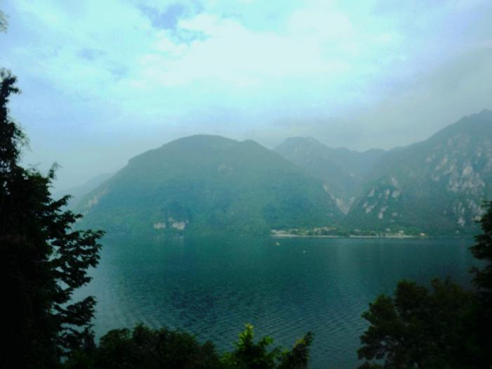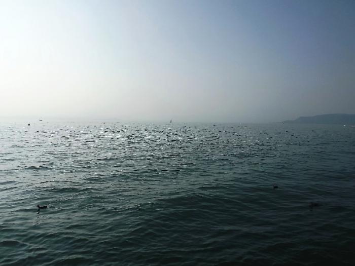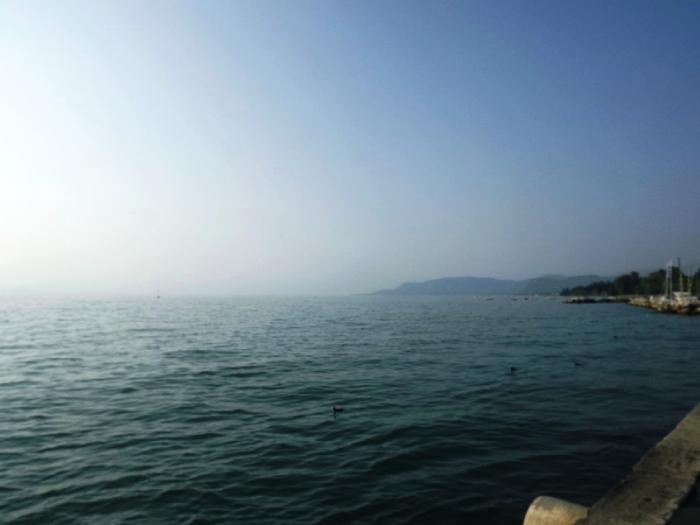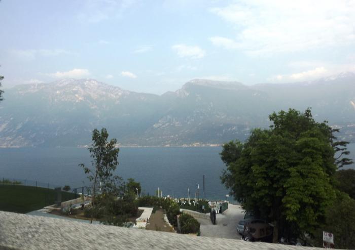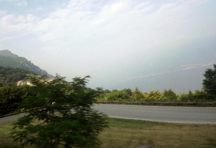 Потом мы долго ехали вдоль озера. Дорога живописная и интересная: скалы, нависающие над дорогой, тоннели, пальмы, кипарисы. Само озеро Гарда похоже на море – берега чуть обозначены, горы в голубоватой дымке, озеро просторное, серебристо-голубое, спокойное.