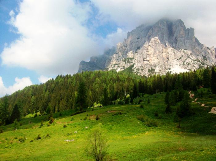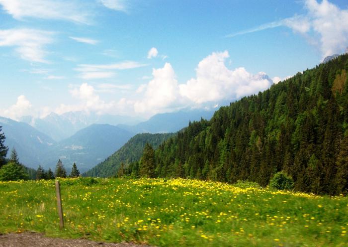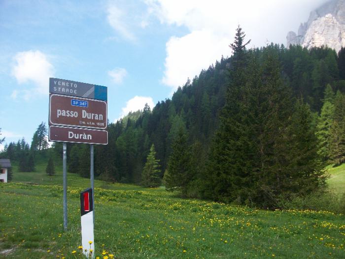 Сейчас нам предстоит приблизиться к еще одной жемчужине Доломитов-Monte Civetta.Поднимаемся на Passo Duran-невысокий – 1601 м. – но живописный, весь в зелени и одуванчиках.