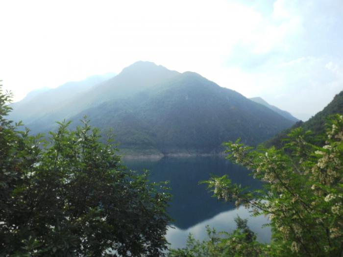 Для того чтобы сделать круг и вернуться к озеру Гарда, необходимо преодолеть невысокий перевал San Rocco высотой 1000 м.Затем снова спуск.По узкой горной дороге, где непросто разъехаться двум машинам, мы ехали в сторону озера Гарда. Над нами нависали скалы. Ущелье было прохладным и мрачноватым. А внизу зеленело озеро. Это Lago di Valvestino (озеро Вальвестино). Вода в нём прохладно-бирюзовая, кое-где – зеленоватая. Оно гармонично смотрелось с окружавшими её горами. На озере построена плотина.