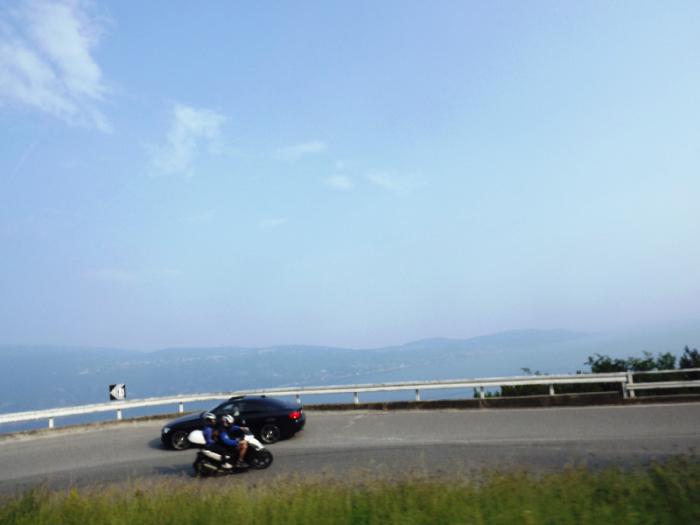 В одном месте попали в пробку – впереди ехал туристический автобус: состоятельные итальянцы (а отдых на озере Гарда – удовольствие недешёвое) возвращались с экскурсии. Он ехал медленно и останавливался в каждом курортном городке на побережье. Таких городков немало на берегу озера Гарда. Внизу, у самого озера, разместились фешенебельные отели.