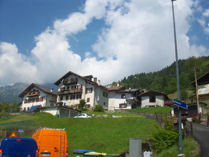 Наконец наш поворот, мы спускаемся вниз с трассы, чтобы затем начать подъем к перевалу Чибиана. По дороге проезжаем Cibiana di Cadore.Эта совсем небольшая деревенька знаменита (в масштабах долины) фресками местного художника. На стенах домов он рисовал портреты жителей этой деревни, и теперь на стенах почти каждого дома есть необычные фрески. Где-то совсем новые, а в других местах уже поблекшие – своего рода картинная галерея под открытым небом.Но мы как-то проездом откровенно говоря фресок не запечатлели