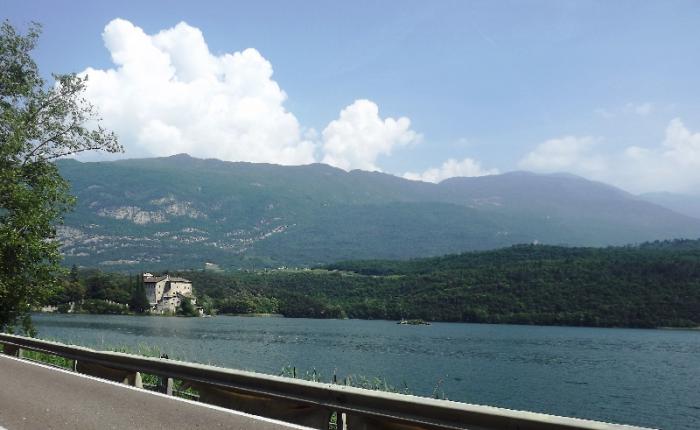 Наконец спустились в долину Вальсугана и поехали в сторону Тренто.Его мы объехали по объездной дороге и снова начался подъем в гору. Слева от нас вели несколько дорог на Monte Bondone-известную вершину в окрестностях Тренто.Первое из озёр, которое мы увидели по дороге, было Lago di Toblino. Вода в озере голубая и спокойная. А на берегу, у самой воды, стоит замок. Кажется, он вырастает прямо из озера.