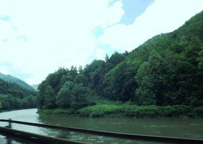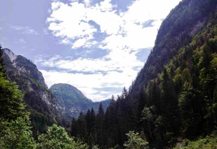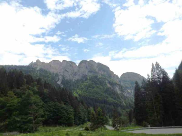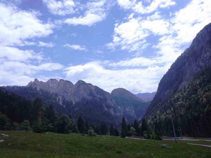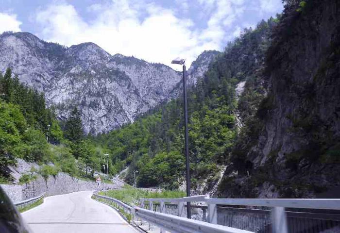 Проезжали через горную местность. Это были последние горы на нашем пути. Они были не такими массивными и мощными как Доломиты. Но пейзажи привлекали своей живописностью: зелень гор, покрытых лесами, горная река с зеленоватым оттенком в зелени берегов и голубое небо.