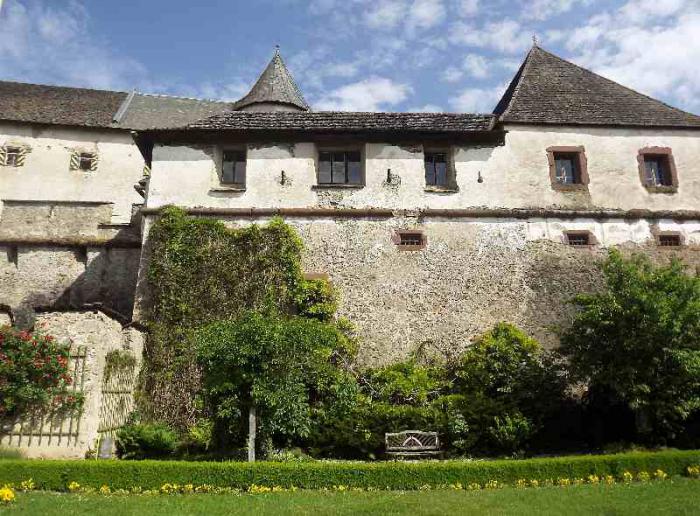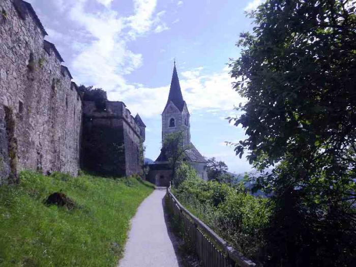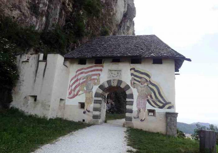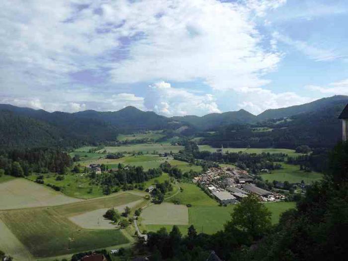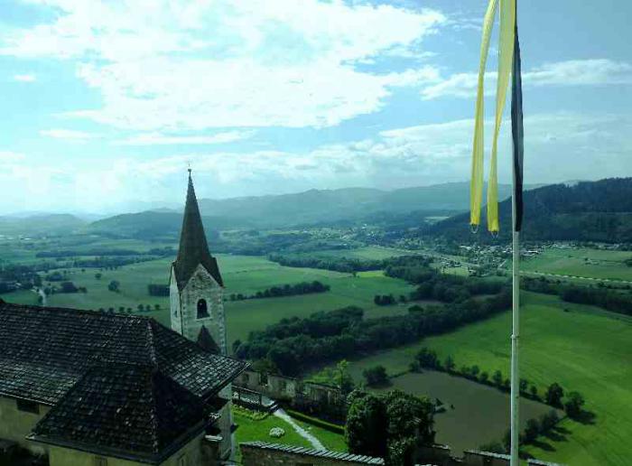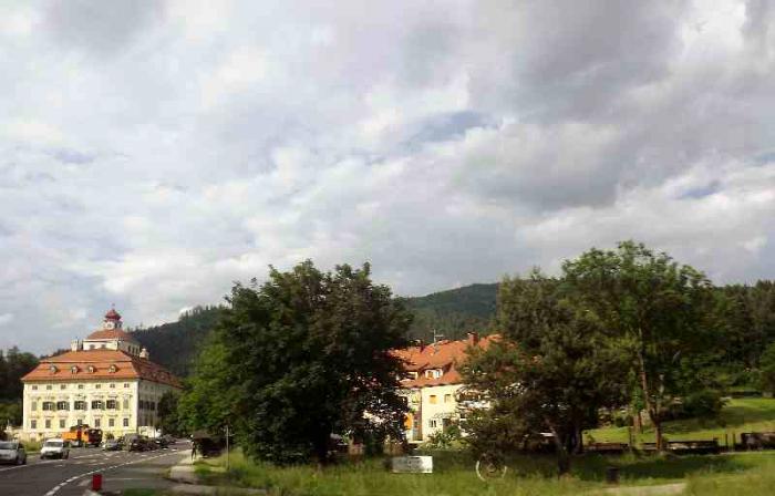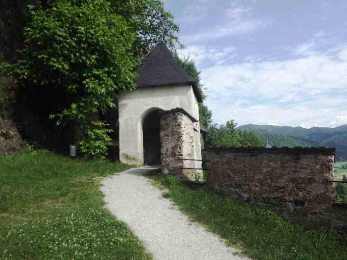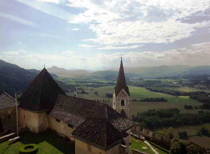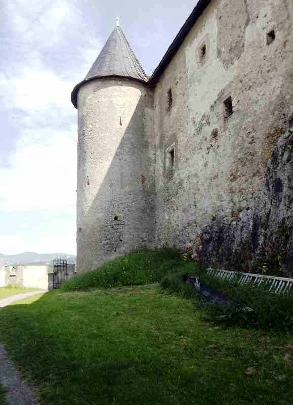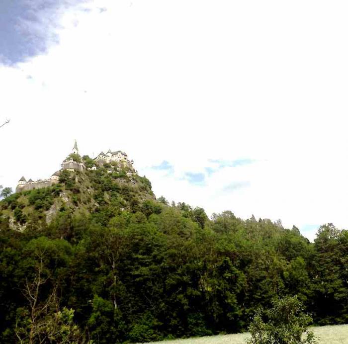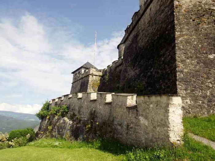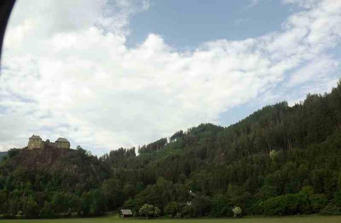 Такой предстала нам крепость Хохостервиц.Чтобы найти ее надо от Клагенфурта свернуть в сторону городка Санкт -Файт-ан-дер-Глан.И в его окрестностях и находится эта крепость.Крепость эта возвышается на скале.