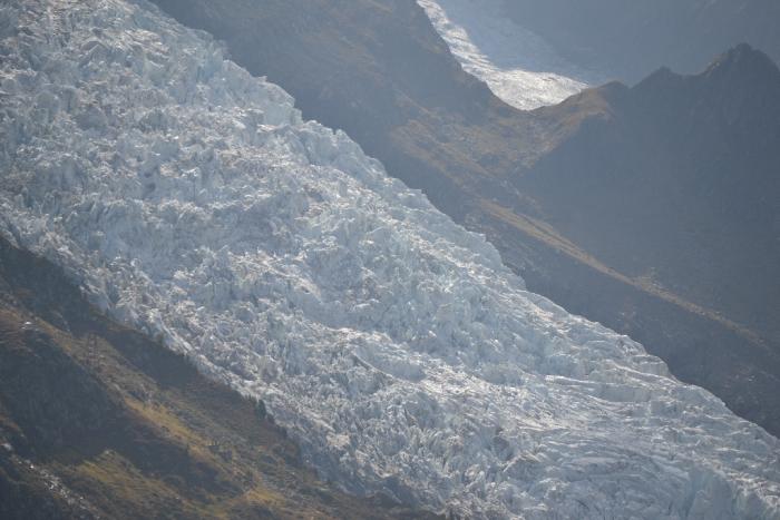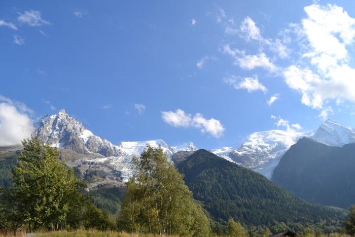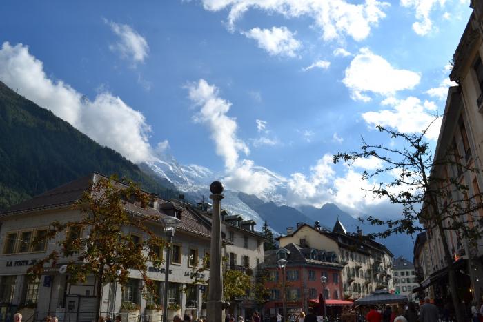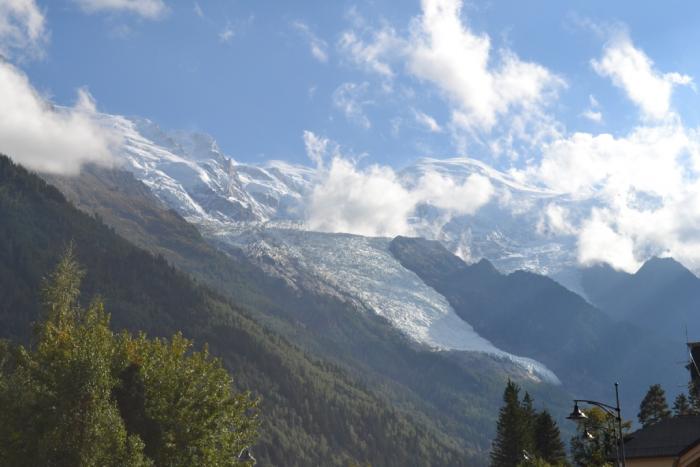 Очень красиво откуда-то из-под небесья, до практически городских улиц спускались два языка ледника, очень белоснежные и необычные. Ведь обычно ледники находятся в низинах долин, а тут просто спускались узкими языками по практически отвесной горе, с самых вершин, предположительно Мон-Блана, спрятанного за облаками.