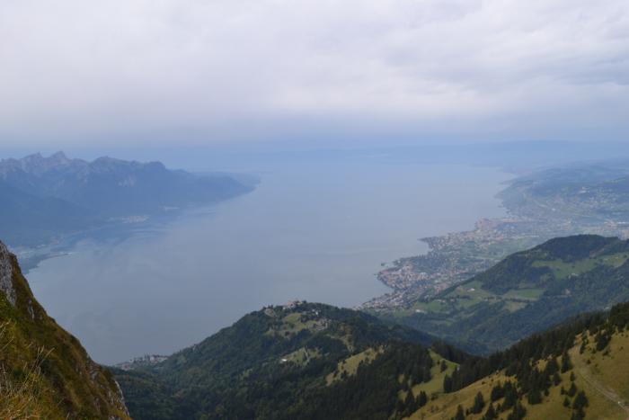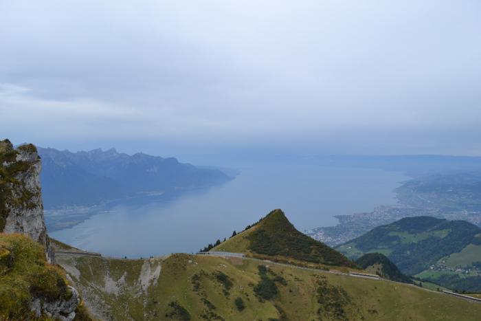 В последний полноценный день мы решили подняться на экскурсионном поезде зубчатой железной дороги, за час поднимающий от вокзала Монтре до вершины над ним (Роше-де-Нэ), чтобы полюбоваться панорамой озера и погулять по высокогорью, а также совершить пешую прогулку части пути обратно.