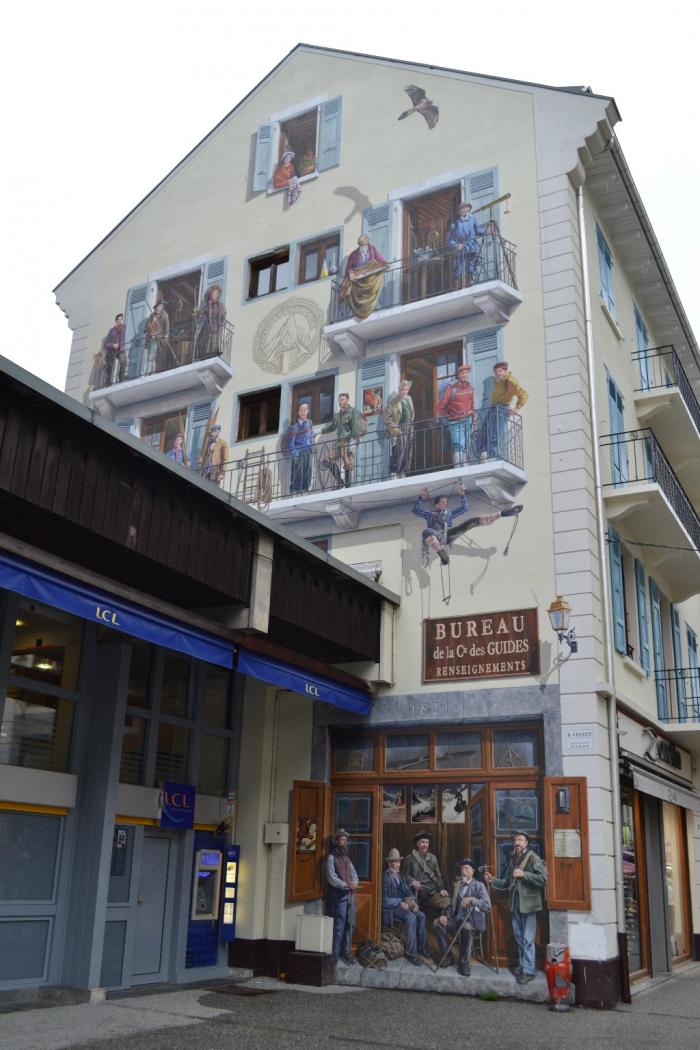 Погода по ходу движения боролась, но, к сожалению, не победила туман, накрывший Мон-Блан и соседние вершины, когда мы добрались до Шамони. Привычно бросив автомобиль в подземной парковке, пошли на исследование городка. Город достаточно крупный, чтобы быть по-настоящему уютным местечком. Погуляли по центру городка, по пешеходной улочке. Архитектура не альпийской деревеньки, все более основательное, но попадаются достаточно интересные здания, к примеру, на некоторых фасадах нарисованы целые картины-фрески.