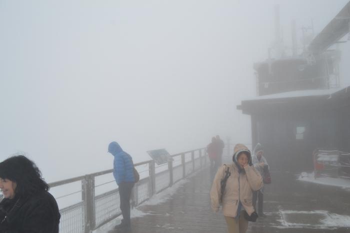 Первая очередь в резвом, практически вертикальном подъеме доставила вагончик канатки до промежуточной станции, почти сразу закинув нас в облако и в конце путешествия, к счастью, выплюнув из него. Но, и из этой точки вершин не было видно, они были закрыты верхним слоем облаков. Преодолеваем не менее вертикальный подъем второй очереди и мы на вершине отвесной скалы, рядом с Мон-Бланом.