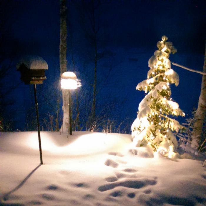 Тем временем стемнело, вокруг лес, лес и только лес. Все в снегу. Вдоль дороги сквозь ели то и дело мелькали огни украшенных гирляндами домов. Ничего не моргает, нет разноцветного попугайства. Только голубые или белые огни спокойно светятся практически на каждом доме. У порога или под окном украшенная гирляндой елка. На окнах либо электрические свечи, либо формы из гирлянд в виде снеговика, елочки и пр. Очень красиво! Восторг!