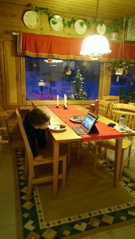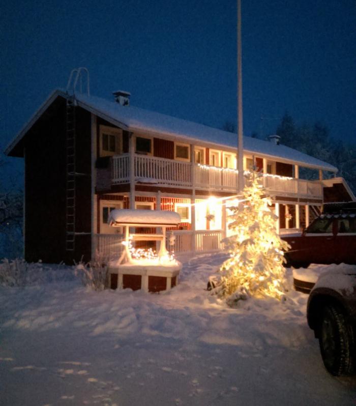 А когда стемнело, стало более четко видно, что место нашего временного пристанища красиво украшено гирляндой, как и все дома вдоль дороги, которые мы видели на протяжении нашего пути по Финляндии. И у нас тоже была своя елочка под окном!