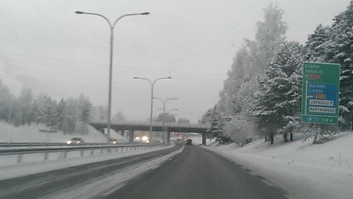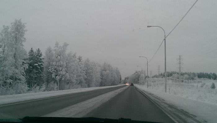 Чем дальше мы ехали, тем температура за бортом опускалась все ниже, достигая местами -25, а дорога превращалась с белоснежный каток. Очень переживали, что если завтра в Рануа будет такая же погода, то поход в зоопарк придется отменить. Хотя я заранее смотрела погоду и обещали до -10. Ограничение 80-100км/ч, об этом предупреждают знаки, но мы более 80 км/ч не ехали — страшно, скользко. Дороги, видно, что чищены, не знаю как объяснить, они такие ребристые, в полосочку (на самом первом фото, если присмотреться, видно). Таким образом финны видимо пытаются добиться сцепления колес с дорогой, раз уж совсем ничем не посыпают.
