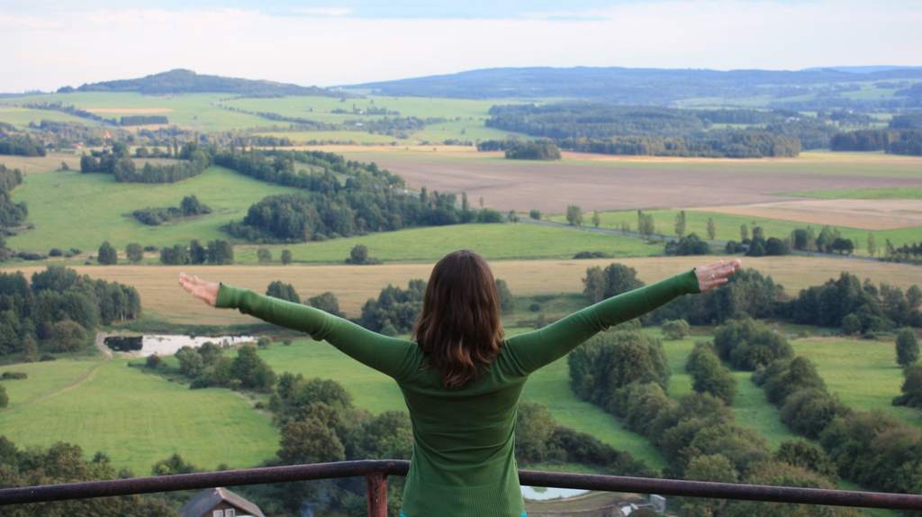 На обратном пути заехали в руины одного замка. Он привлек наше внимание еще по дороге в Карловы вары. Поднялись на высокую гору, оттуда прекрасный вид! Место не туристическое, поэтому людей немного.