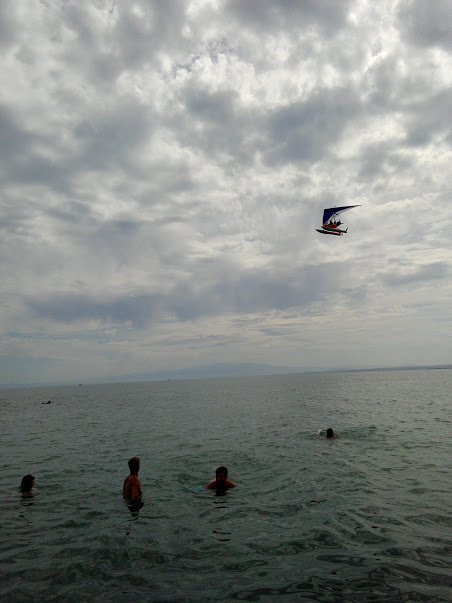 Мы заехали в аэропорт в Учарале и выяснили, что из Алматы летает самолёт 5 раз в неделю. Цена вопроса — 10 000 тенге в один конец. Детские — 5000. Пока будет лучше на нём. С аэропорта 12 км. до посёлка. Отвезут. А там автобусом, километров 65. С погодой повезло. Купались, загорали. Жена, как и в первый приезд, летала на дельтаплане над озером.