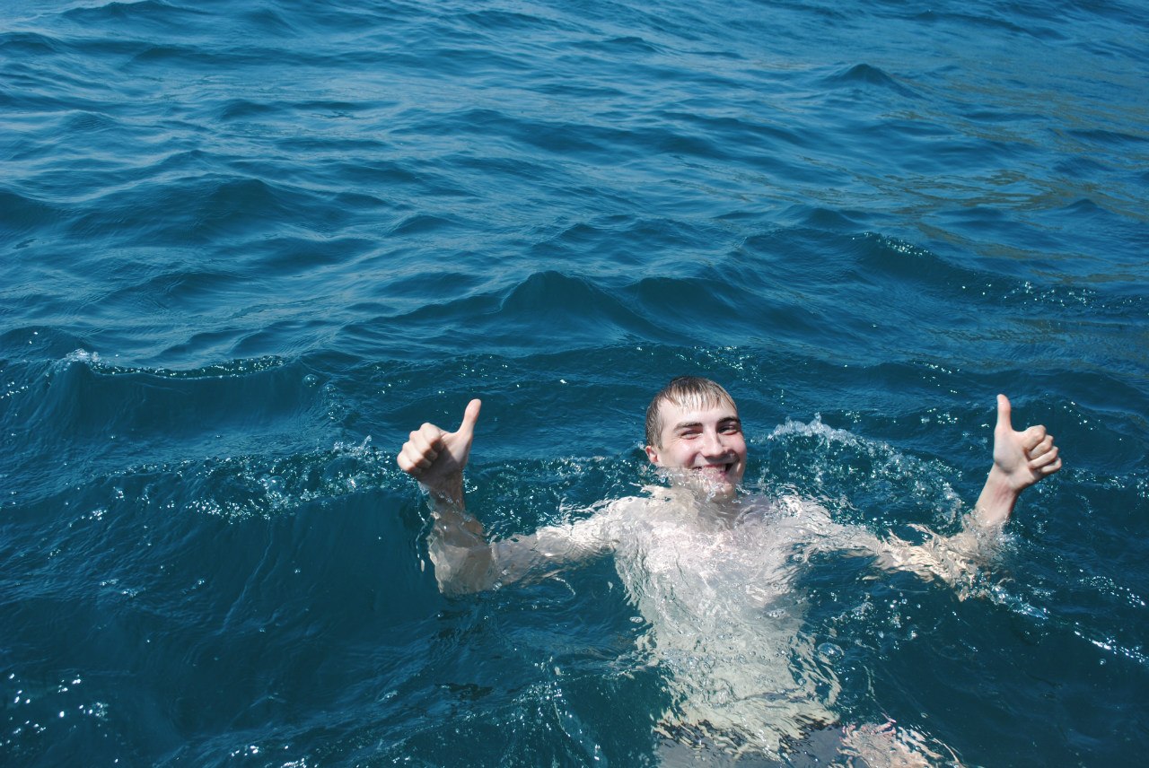 Проспать долго нам не дало солнце, в палатке это лучший будильник – при свете Солнца становится душно в палатке и спать невозможно, но нам хватило еще 4 часов сна и мы были бодрые. Конечно, первым делом пошли купаться в море, которого мы так желали. Шторм еще не стих и волны были довольно большие, но погода была ясная и солнечная – идеальная погода для купания. Вода чистая, настроение отличное, мечтая моя сбылась – я купаюсь в Черном море!