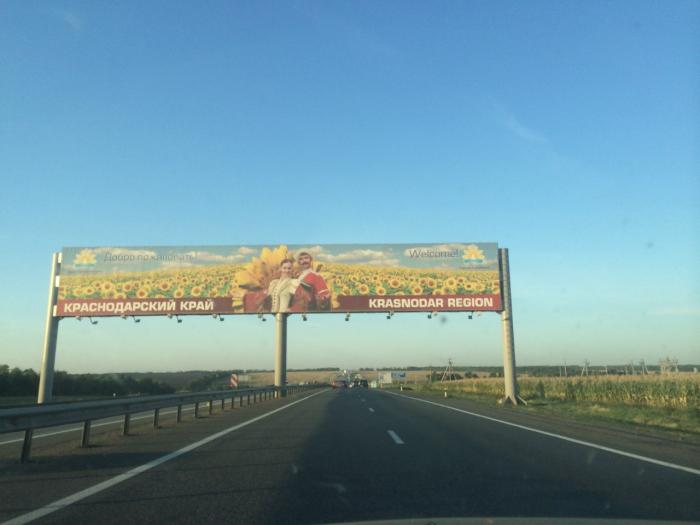 Вот мы все ближе к цели — въезжаем в Краснодарский край, значит еще немного осталось. Чем ближе к югу, тем больше встречается равнин с одинокими деревьями, много плантаций винограда, подсолнухов, что не встретишь у нас в Татарстане.