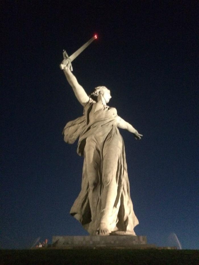 Приехали в Волгоград к 22 часам, уже стемнело. Родину-мать было видно еще задолго до подъезда к Мамаеву кургану, все в машине были в предвкушении встречи с этой мощной статуей. Оказалось даже лучше, что мы приехали ночью. С Мамаева кургана открывался шикарный вид на ночной Волгоград, Родина-мать, освещаемая прожекторами, была еще грознее во мраке ночи. Очень впечатляет своей мощью. Здесь особенно сильно проявляется чувство благодарности дедам, которые стояли в Сталинграде насмерть лишь бы фашизм не прошел.
