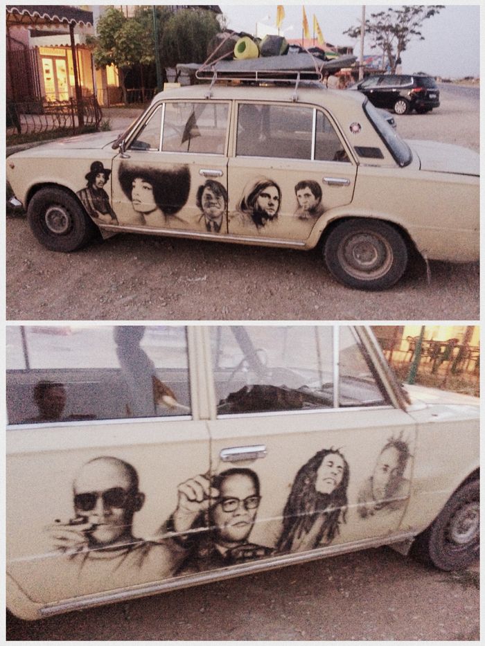Вечером прогулялись по поселку, посидели на берегу моря. Пока гуляли встретили такую интересно раскрашенную машину. Как я понял покойные популярные музыканты.