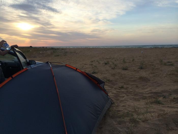 Проспав около 2 часов, я решил все таки дотянуть до Феодосии, расстояние было небольшое. Приехали мы уже к рассвету в пригород Феодосии – в поселок Приморский, дорога шла мимо берега, и мы увидели палатки на пляже, недолго думая свернули к ним, разбили палатку и отключились. После 2 суток в сидячем положении растянуться в горизонтальном положении в палатке просто блаженство.