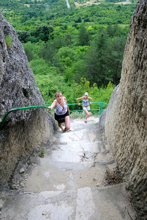 Но это еще не всё. Чуть левее на самый верх скалы ведет вырубленная в породе лестница. Подъем возможно покажется тяжеловат для неподготовленного путника, но он стоит того, к тому ж частые скамейки дают возможность для отдыха, главно не забыть с собой живительной влаги в виде сухого красного винца, ну или чего-то в этом роде.