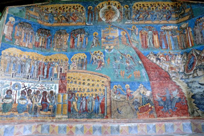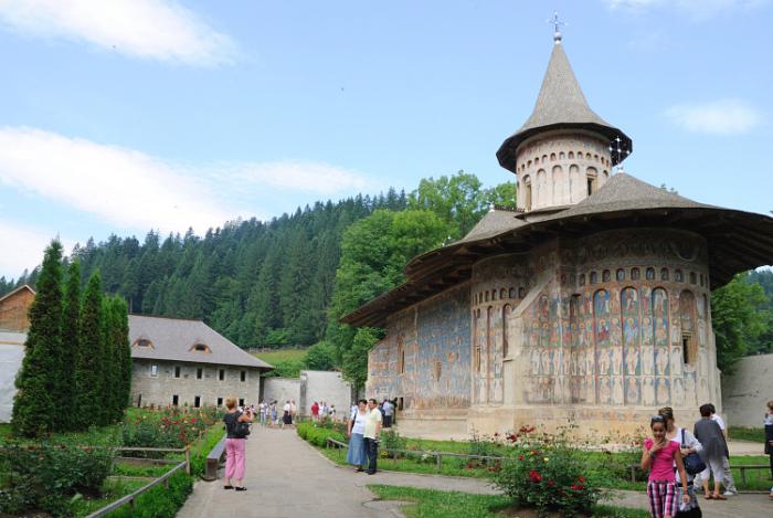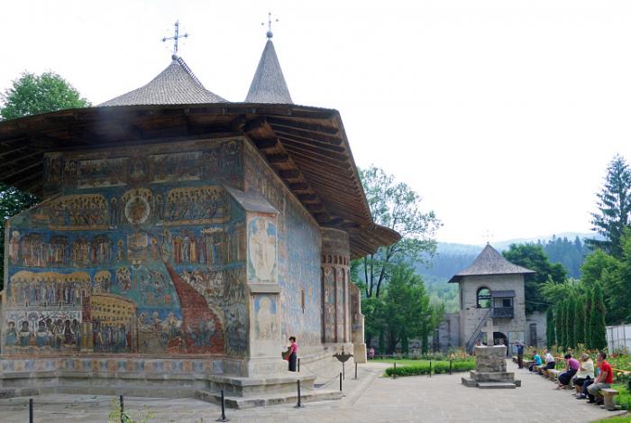 Эту церковь за красоту небесной синевы фресок прозвали Сикстинской капеллой Востока. Когда-то, основанный аж в 1488 году святым господарем Стефаном Великим как мужской, монастырь Воронец был сначала молдавским и подлежал закрытию в 1786-ом, когда территория стала вдруг считаться австрийской. Заново открыт в 1991 году — но уже в качестве женской обители и уже в Румынии. О как. Глаз действительно не оторвать. Внутрь я не заходил – воскресный день, там и без меня полно народу было – но и снаружи есть на что посмотреть. Фрески изображают множество сцен, в которых по силам разобраться лишь грамотному теологу. А для непосвященных остается лишь догадываться что к чему, но чисто визуально все понятно и различимо, где хорошие и где плохие, можно шаг за шагом идти вдоль церкви и представлять описываемые события. Кроме того он был еще и книгохранилищем, где содержалось множество текстов, переведенных на молдавский (румынский) язык. И конечно же здесь множество роз. И всё это в обрамлении гор, которые уже подступают всё ближе и ближе.