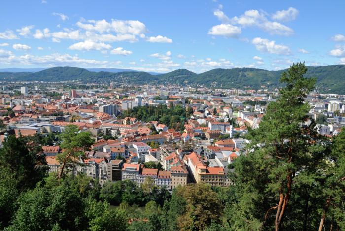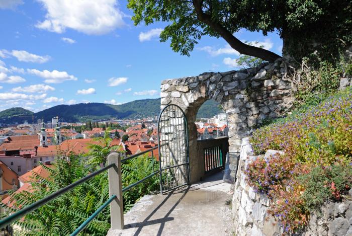 Как и во всех заграничных городках проблемы с парковкой. Сначала мы весьма удачно припарковались по делу у магазинчика, и поехали оттуда искать фуникулер к местной достопримечательности – замку Шлоссберг. Кабы знать, что мы прямо от него и уехали. Но сразу не заметили, ожидали какого-то подъемника, а там оказалась вполне респектабельного вида витрина с дверями, где внутри касса и железная дорога, уходящая вверх. А мы сначала выехали на главную площадь. Прямо именно выехали. Там я и хотел бросить машину, но на всякий случай пошел интересоваться по этому поводу к двум дамам-полицейским, прогуливающимся поблизости. Жутко непонятный язык, но ясно стало то, что тут нельзя, а где можно они не знают. Ну женщины, чего с них взять. Нашелся какой-то проулок, где удалось приткнуть нашу красотку к обочине, осторожненько растолкав соседей.