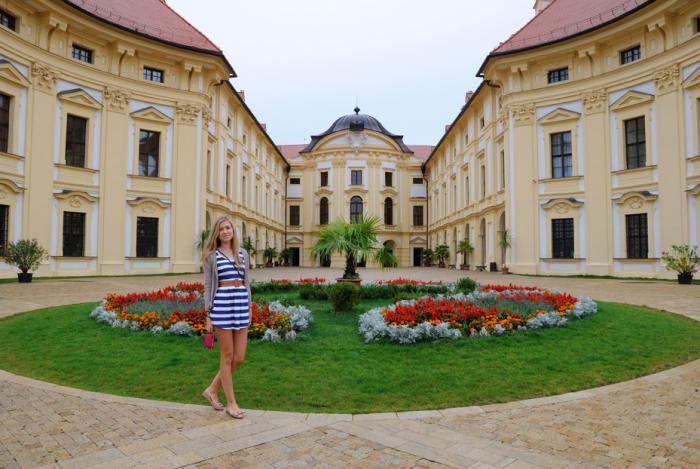 На подходе мы весьма удачно разминулись с большой экскурсией и смогли пройтись в одиночестве. Накануне в парке проходил какой-то фестиваль, вроде из-за него нам места и не хватило сначала. Вечером действительно вовсю слышалась музыка. И в парке шел разбор аппаратуры. Посередине активно бил фонтан, но при нашем появлении вдруг резко сник и пропал. Парк небольшой, как и дворец. Зато именно здесь Наполеон подписал мирный договор с Россией и Австрией после аустерлицкого сражения.