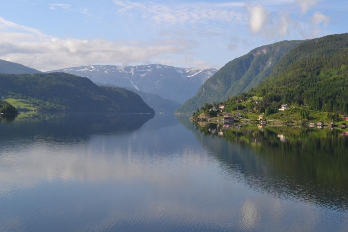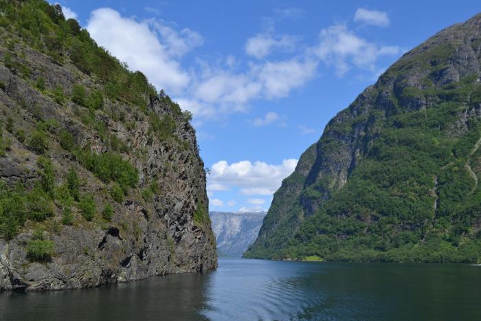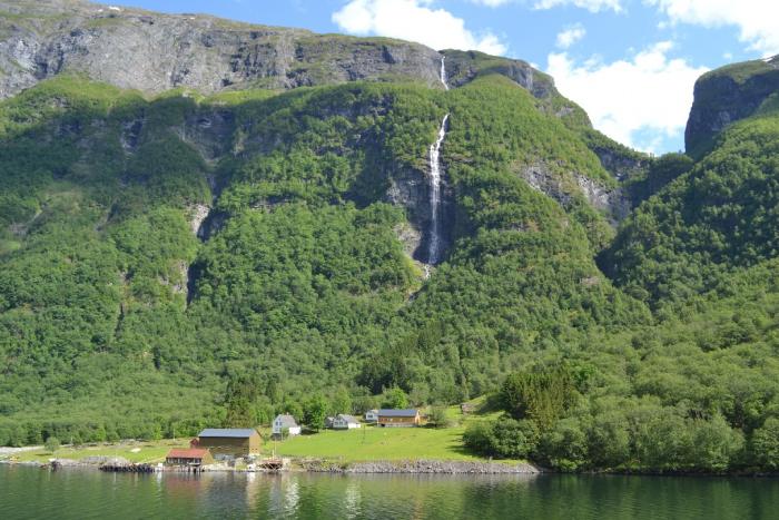 Далее, с 13:20 до 18:10 проехали туда и обратно по двум красивым притокам фьорда – Аурландфьорду и Нюрейфьорду. Автомобильный паром ходит только раз в день и мы на него не успевали после поезда, поэтому пришлось кататься в оба конца. Но с другой стороны, вдоволь насладились красотой, тем более, что погода в этот день была отличная и после предыдущих двух насыщенных тяжелых дней, получился день расслабухи.
