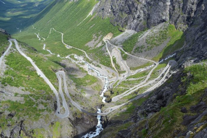 В 9:30 выехали из парковки отеля. Сперва вдоль фьорда ехали до Андальснеса, откуда свернули на 63 трассу и поехали, собственно по дороге троллей. Дело стоящее и захватывающее (т.е. рекомендации по посещению самые высокие). Хоть это и не самый большой серпантин в Норвегии, но точно один из самых красивых, естественно с двумя мощными водопадами и красивой панорамой. Наверху пару смотровых, где можно спокойно полюбоваться видом и пофотографироваться. Мы, кстати решили еще раз съехать по серпантину вниз, до мостика, рядом с которым льётся водопад, ну и подняться обратно.
