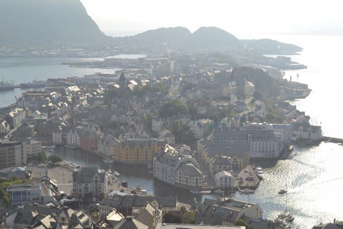 В конечный пункт нашего сегодняшнего дня путешествия – в город Олесунн приехали к 17 часам. Отель Scandic не понравился, номер хоть был и большой, но неуютный и пах сыростью. Парковка в цоколе, платная, около 800 рублей за сутки. Весь вечер гуляли по городу, город интересной архитектуры. Около сотни лет назад он полностью сгорел и за пару лет его отстроили заново, но в единой архитектурном европейском стиле модерн, не похожем на другие деревянные городки Норвегии. Естественно не поленились размяться и поднялись с городского парка на смотровую Фьелльстуа полюбоваться на город сверху.
